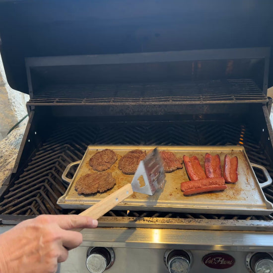 One tool. All the grill-side essentials. This 4-in-1 BBQ spatula is your go-to for flipping, slicing, tenderizing, and cracking open a cold one—all without missing a beat. Featuring a sturdy stainless steel head and a comfortable wood handle, it combines a practical spatula, serrated cutting edge, meat tenderizer, and built-in bottle opener. Whether you’re working the pit or manning the tailgate, this multitasker has your back.